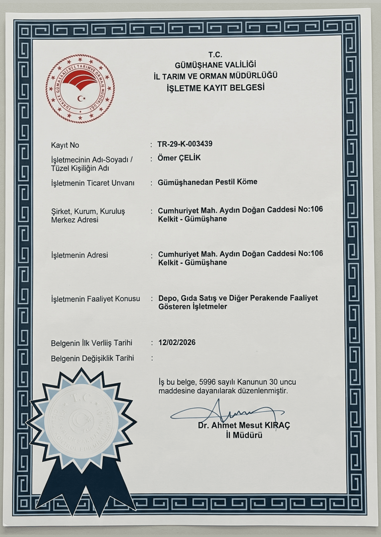 Sizde Pestil Köme tadına doyum olmaz diyenlerdenseniz Sağlık Bakanlığı Onaylı (TR 29-K 001718) imalat ve satış firmamızdan web sitemiz aracılığıyla Gümüşhane’ye has Pestil, Köme , Pestil TatlısıPekmez ve Yöresel Ürünler‘i sipariş edebilir. Bu eşsiz lezzetlerin tadına varabilirsiniz.